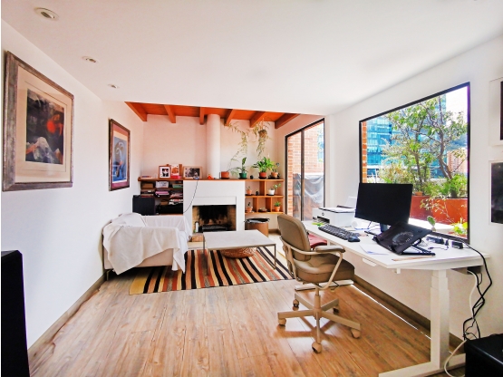 Apartamento duplex con excelente iluminación natural, en el primer nivel encontramos la cocina semi abierta con barra hacía el comedor, sala con chimenea y salida a la terraza de 12 mts. En el segundo nivel está la habitación principal, 1 baño completo y estudio. SIN ASCENSOR. El conjunto cuenta con vigilancia 24 horas, parqueaderos de visitantes, hermosas zonas verdes, cancha múltiple, salón comunal, zona infantil y CCTV. El conjunto ganó el Premio Nacional de Arquitectura. El valor del arriendo no incluye la administración.